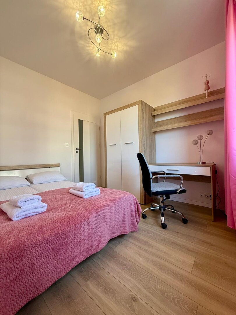 The Strefa Czasu Apartment is a modern, fully equipped apartment in Toruń, with an area of approximately 45 m², suitable for up to 4 people. Located in a recently built housing estate with private parking, it is 200 meters from a tram stop, providing easy access to Toruń's Old Town without having to park in the city center. The apartment combines a functional layout with comfortable everyday living and access to local shopping facilities nearby. The bright and ergonomic interiors are ideal for relaxation, remote work, and both short and long stays in Toruń. The standard of furnishings meets the basic expectations of individual guests, couples, and families. Type and Standard