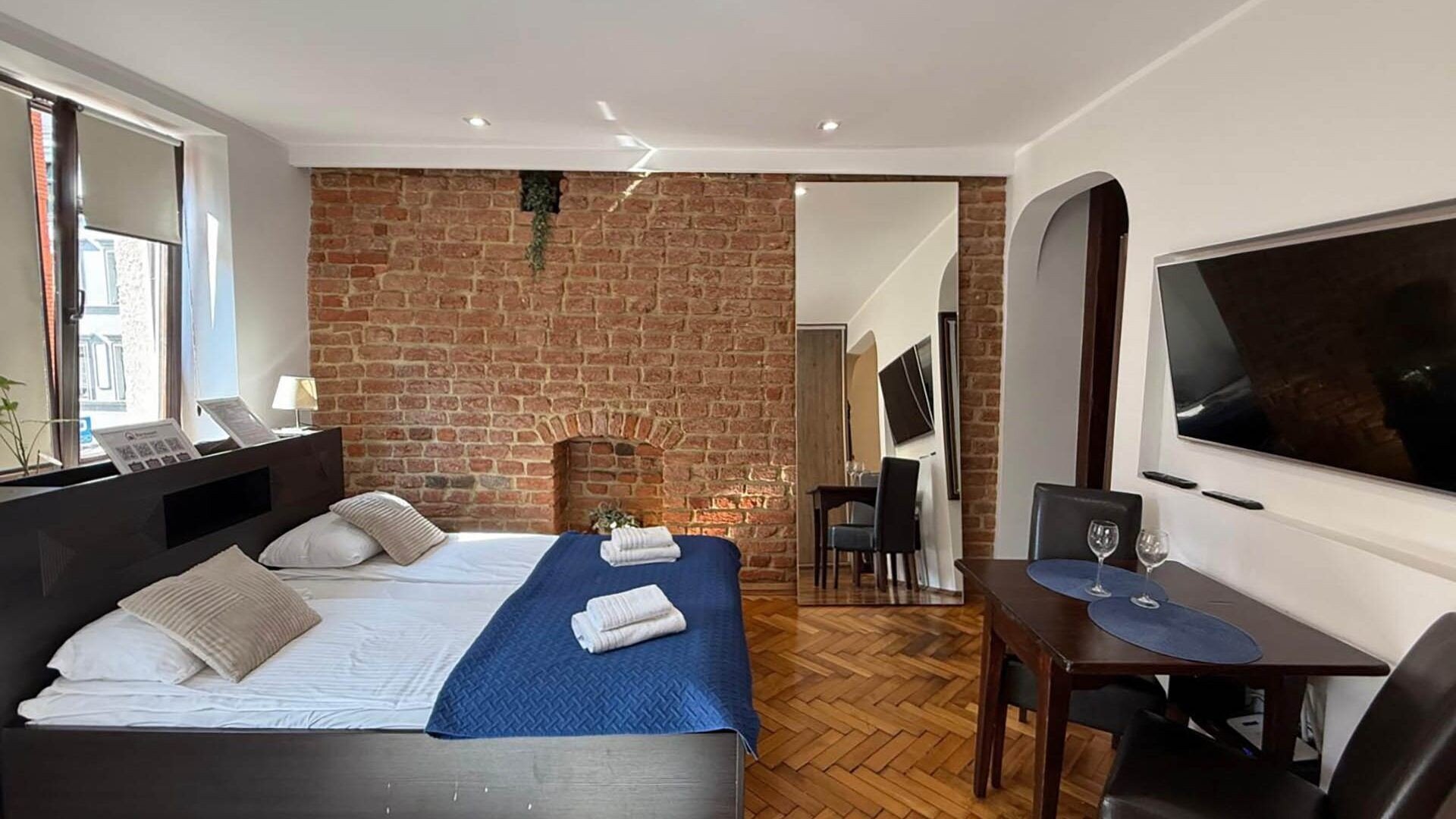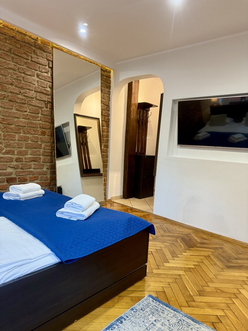 Kitchen-Kitchenette; Refrigerator; hob; oven; microwave; electric kettle; kitchenware and accessories; dining area.Technology-Free Wi-Fi; flat-screen TV with cable TV; power sockets by the bed; reading light.Bathroom and Amenities-Private bathroom with shower; Hairdryer; Towels; Basic hygiene products; Cleaning products; Iron; Clothes dryer.Location-Central Toruń; in the immediate vicinity of the Old Market Square and tourist attractions; Restaurants, cafes, shops, and services within walking distance; Convenient public transportation access.Target GroupsCouples; Individual guests; Business trips; Short tourist stays; Small groups.