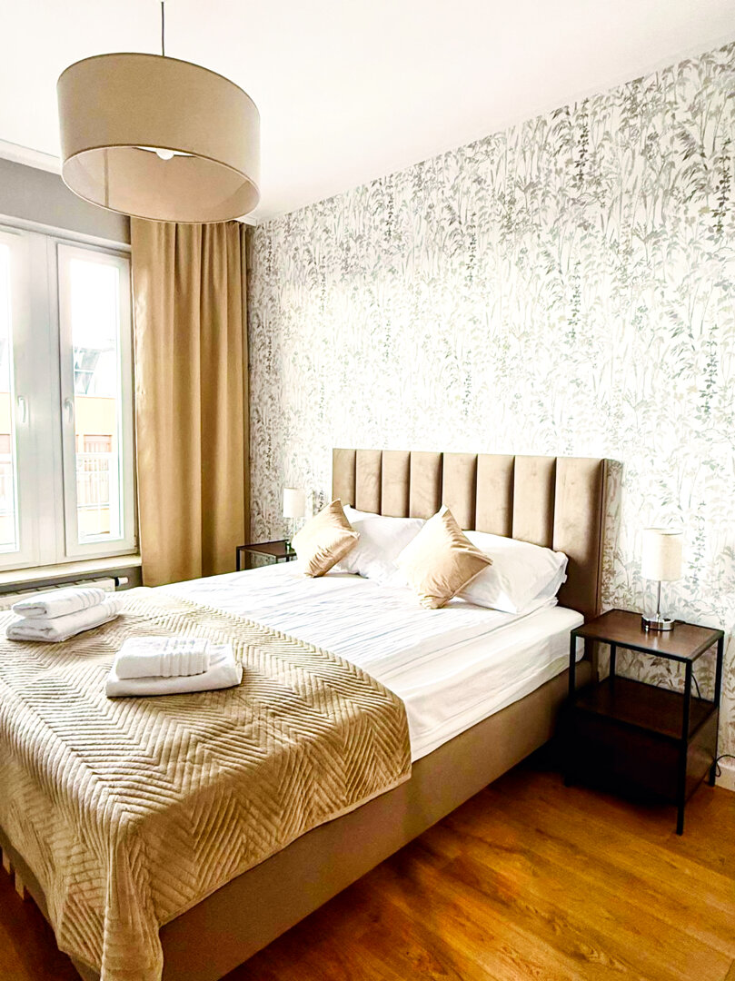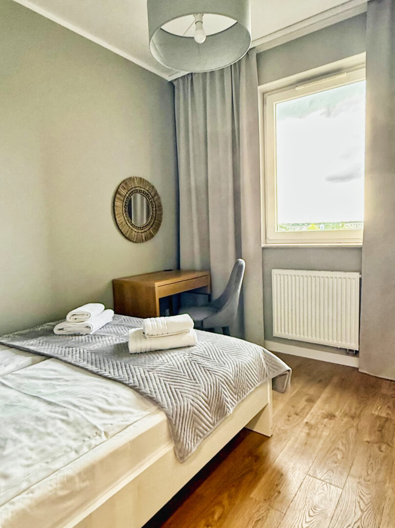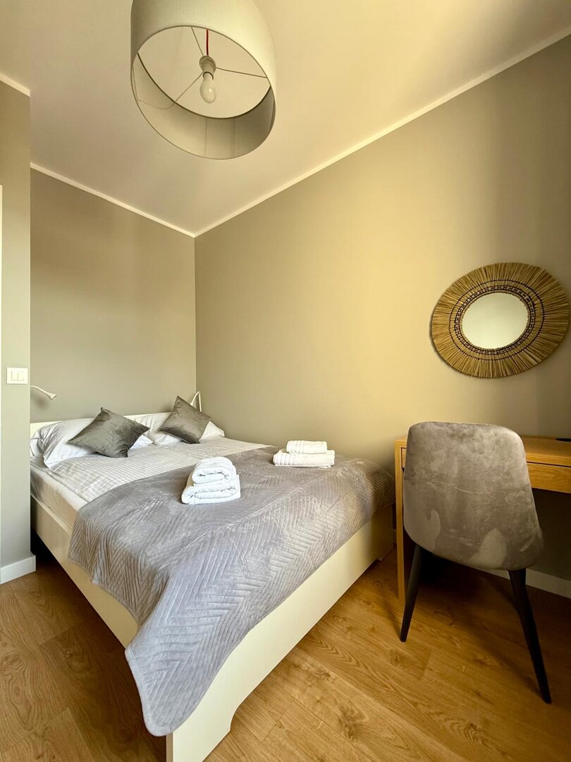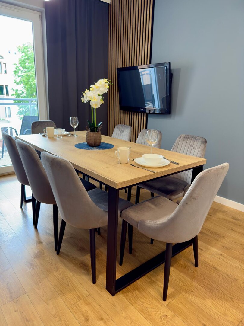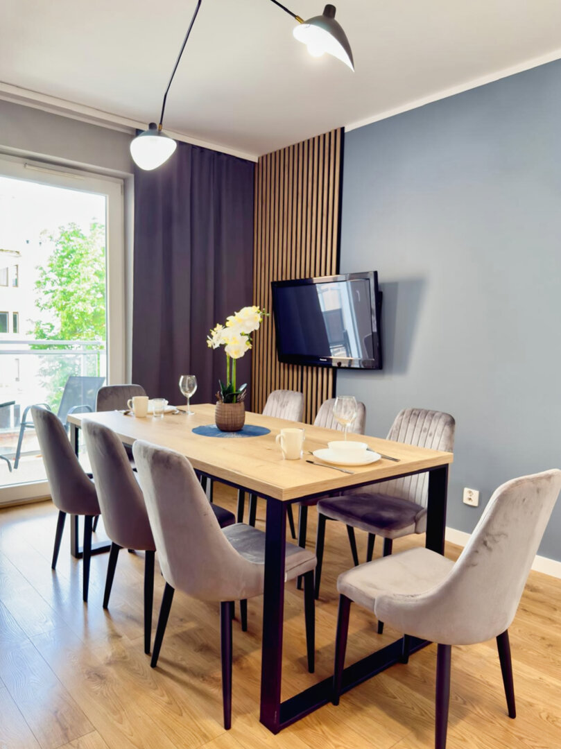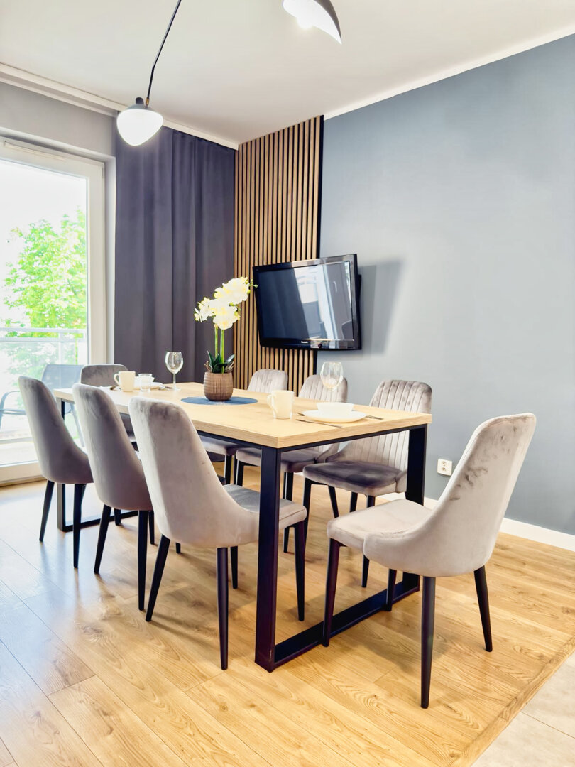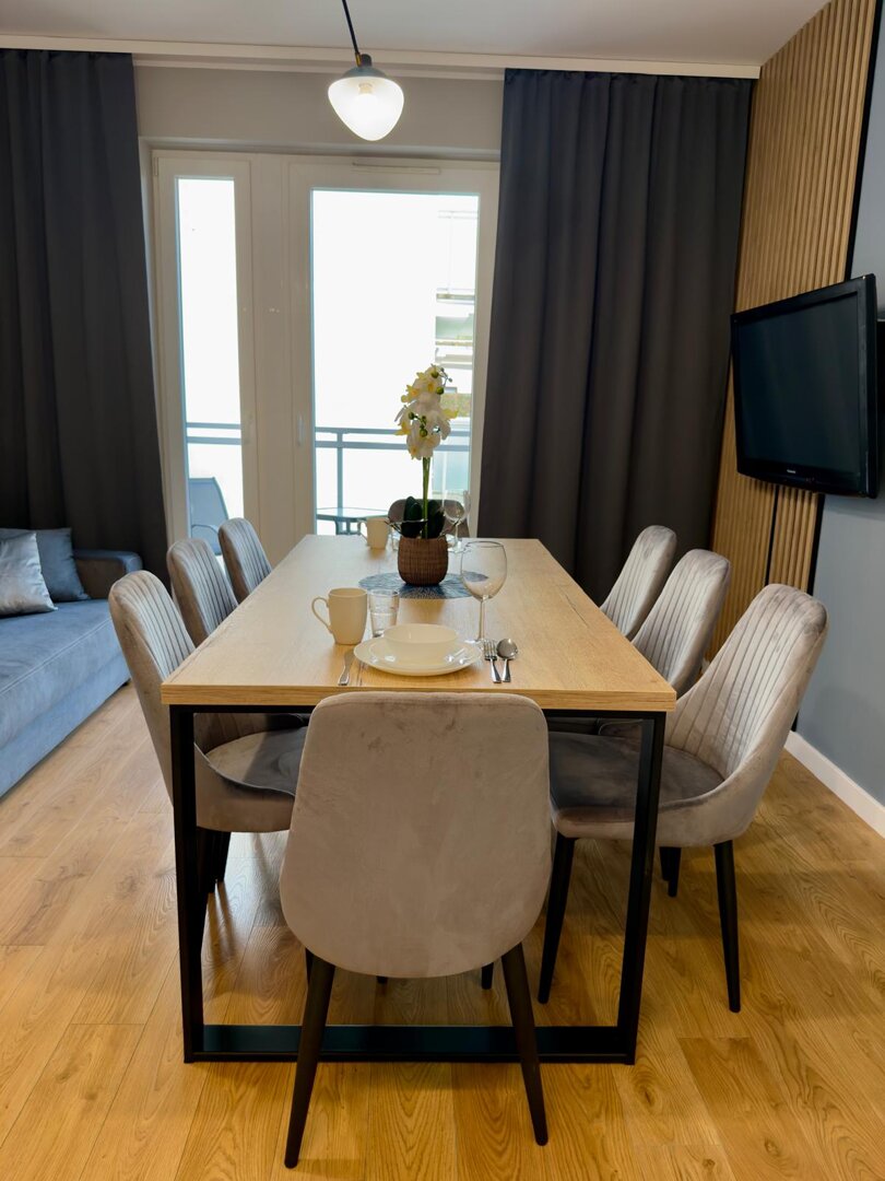 The University Apartment is a spacious private apartment in Toruń, on Bydgoskie Przedmieście Street, close to Nicolaus Copernicus University. Designed with groups and families in mind, it offers comfortable accommodations for up to 8 people, a clear division of day and night zones, and functional furnishings. Guests have access to a kitchenette, a lounge area, and a workspace, making it ideal for both leisure and business stays. The location combines the tranquility of a green neighborhood with good transport links to the city center and popular attractions. The standard of furnishings meets guests' everyday needs without any marketing or frills. Type and StandardThe University Apartment is a spacious private apartment in Toruń, on Bydgoskie Przedmieście Street, close to Nicolaus Copernicus University. Designed with groups and families in mind, it offers comfortable accommodations for up to 8 people, a clear division of day and night zones, and functional furnishings. Guests have access to a kitchenette, a lounge area, and a workspace, making it ideal for both leisure and business stays. The location combines the tranquility of a green neighborhood with good transport links to the city center and popular attractions. The standard of furnishings meets guests' everyday needs without any marketing or frills.