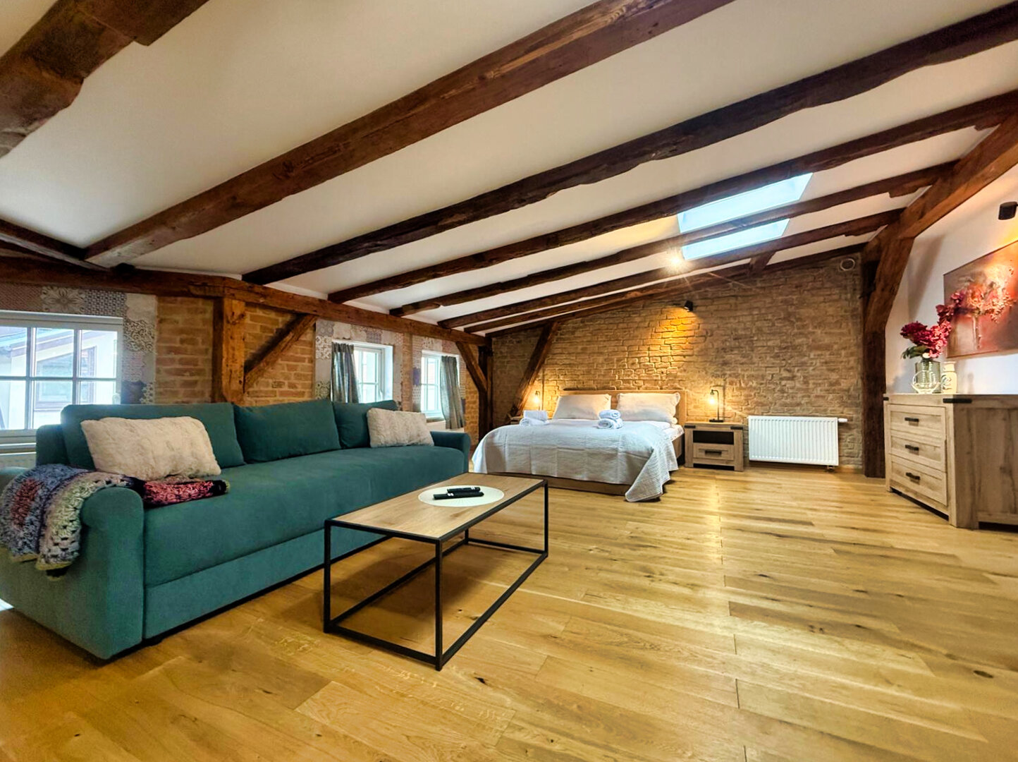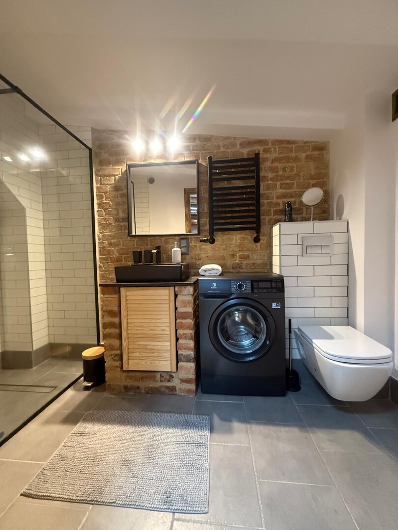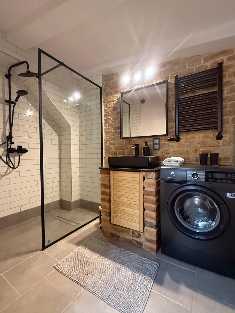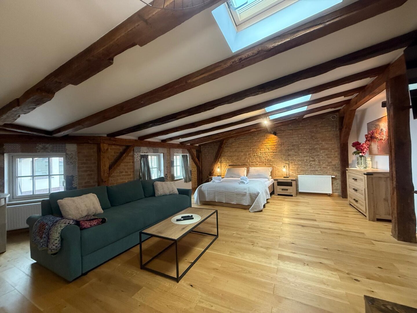 Type and Standard• Self-contained apartment• 50 m², attic of a historic tenement house• Max. 4 people• Central location in Toruń Old Town• No elevator (4th floor)• Private entranceSpace and sleeping• Double bed• Living area with a sofa bed• Storage space• Dining table, lounge areaKitchen• Fully equipped• Refrigerator• Stovetop• Coffee maker• Electric kettle• Kitchenware, microwave