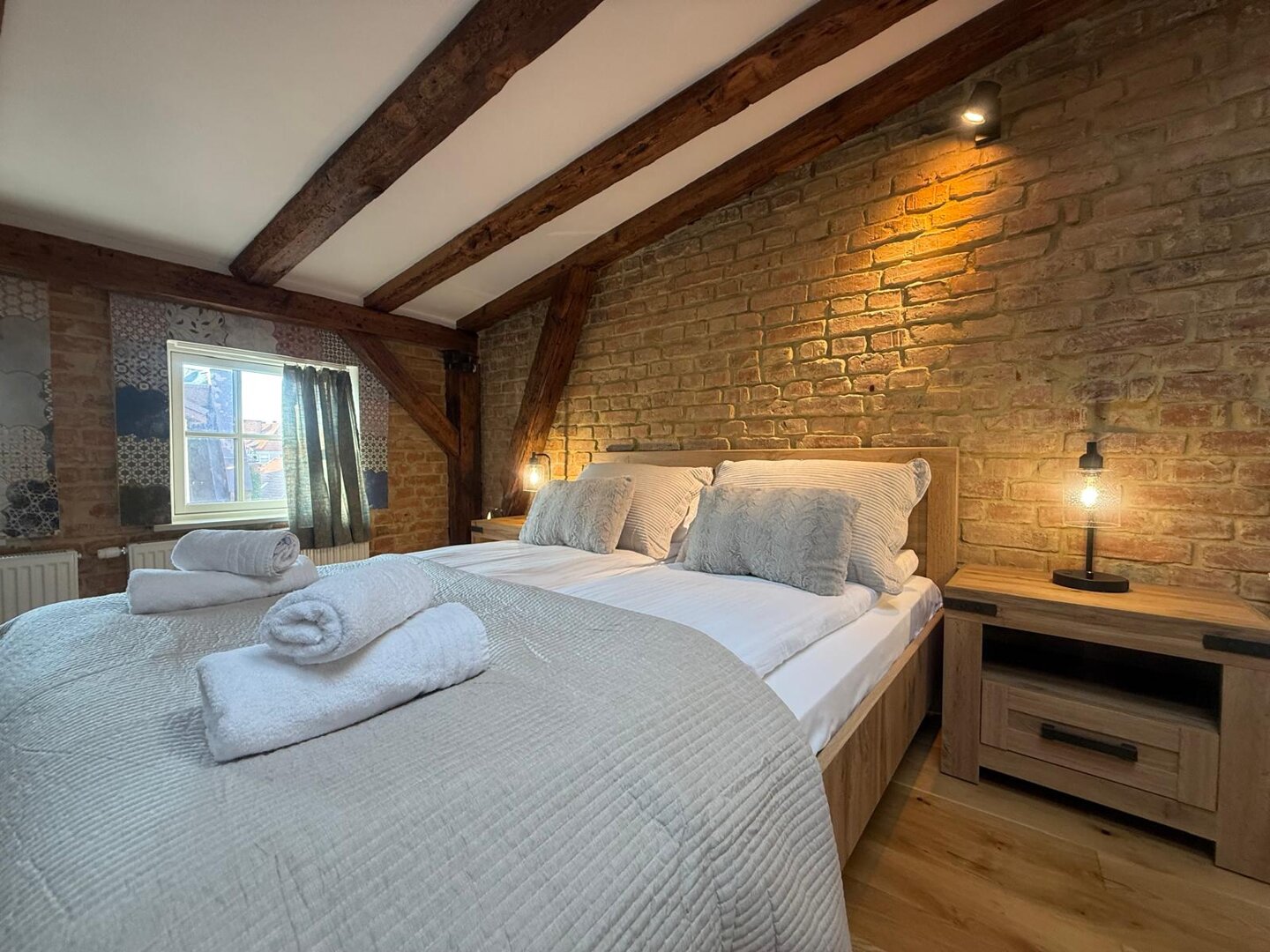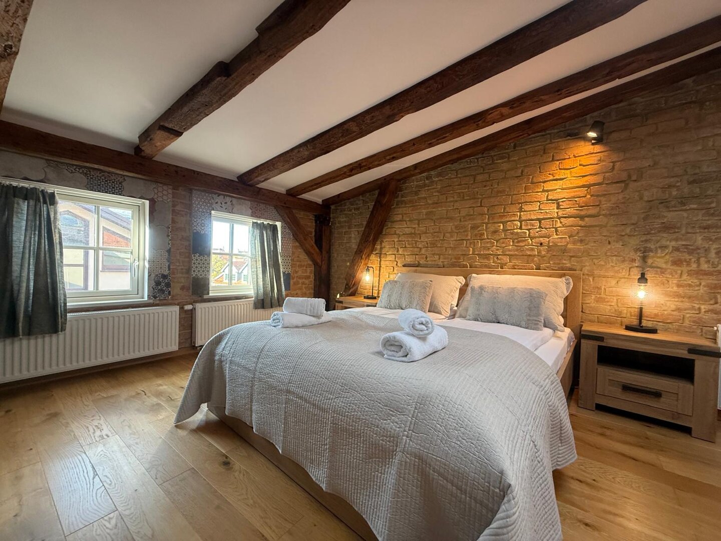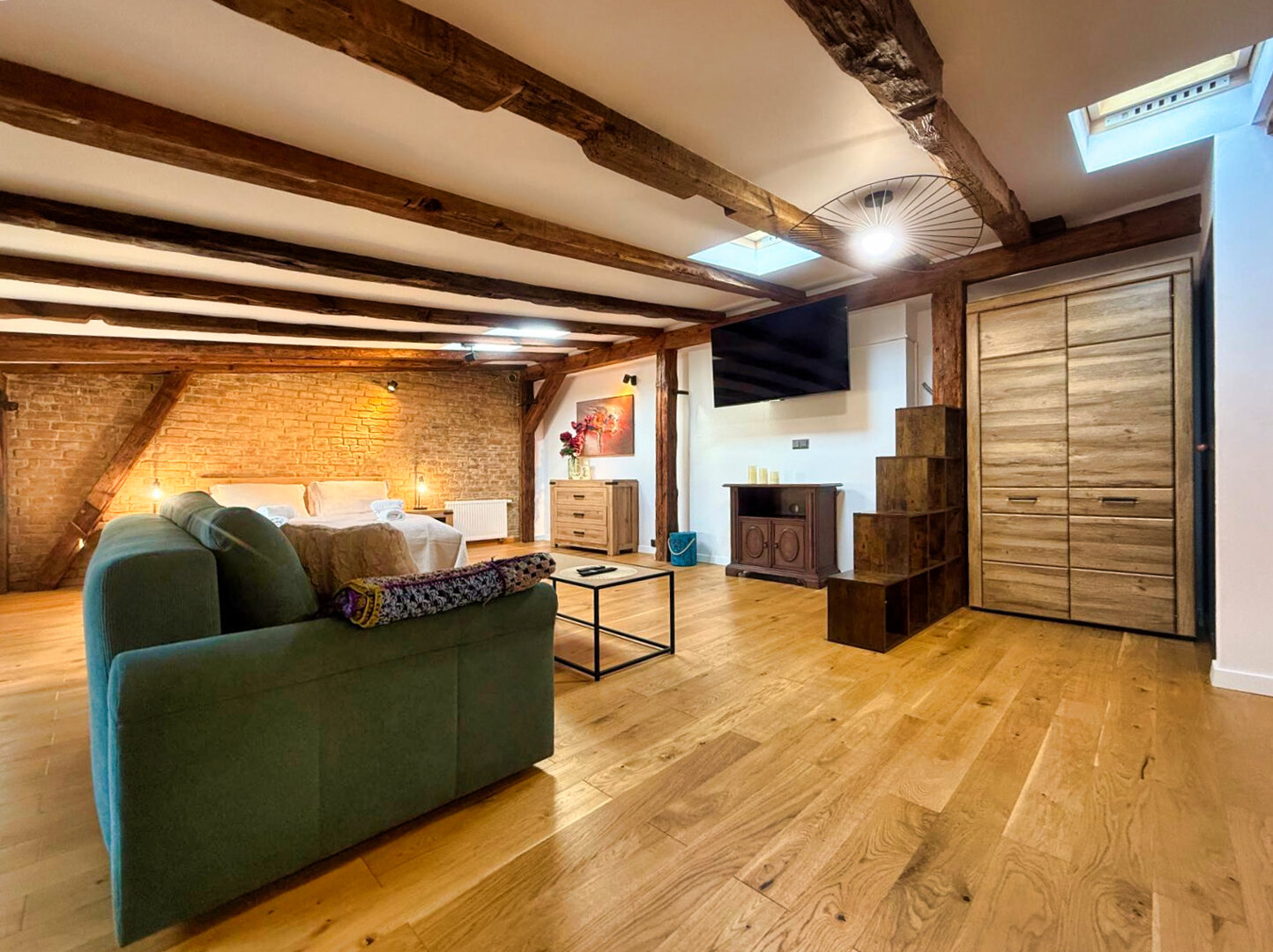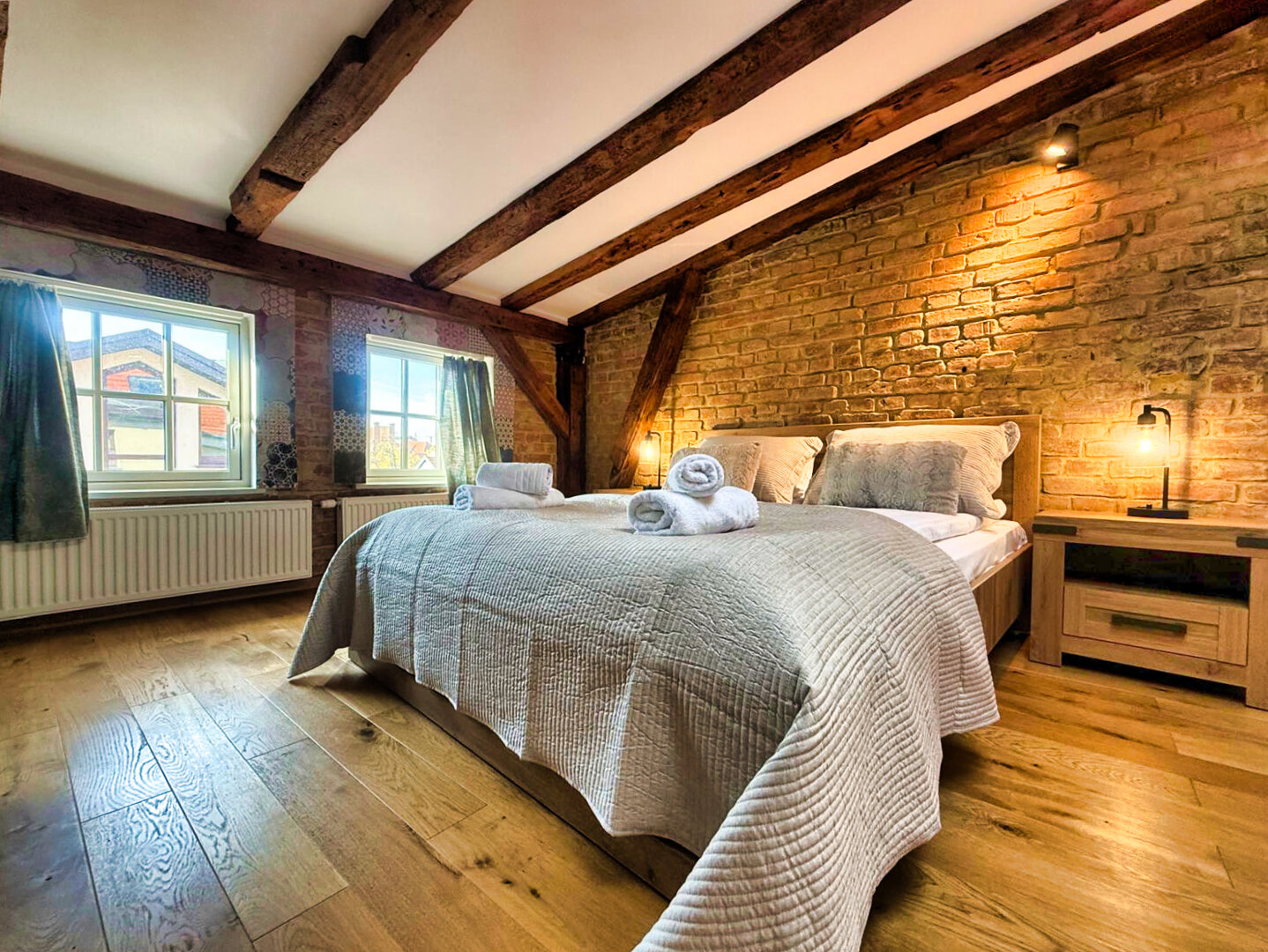 Type and Standard• Self-contained apartment• 50 m², attic of a historic tenement house• Max. 4 people• Central location in Toruń Old Town• No elevator (4th floor)• Private entranceSpace and sleeping• Double bed• Living area with a sofa bed• Storage space• Dining table, lounge areaKitchen• Fully equipped• Refrigerator• Stovetop• Coffee maker• Electric kettle• Kitchenware, microwave