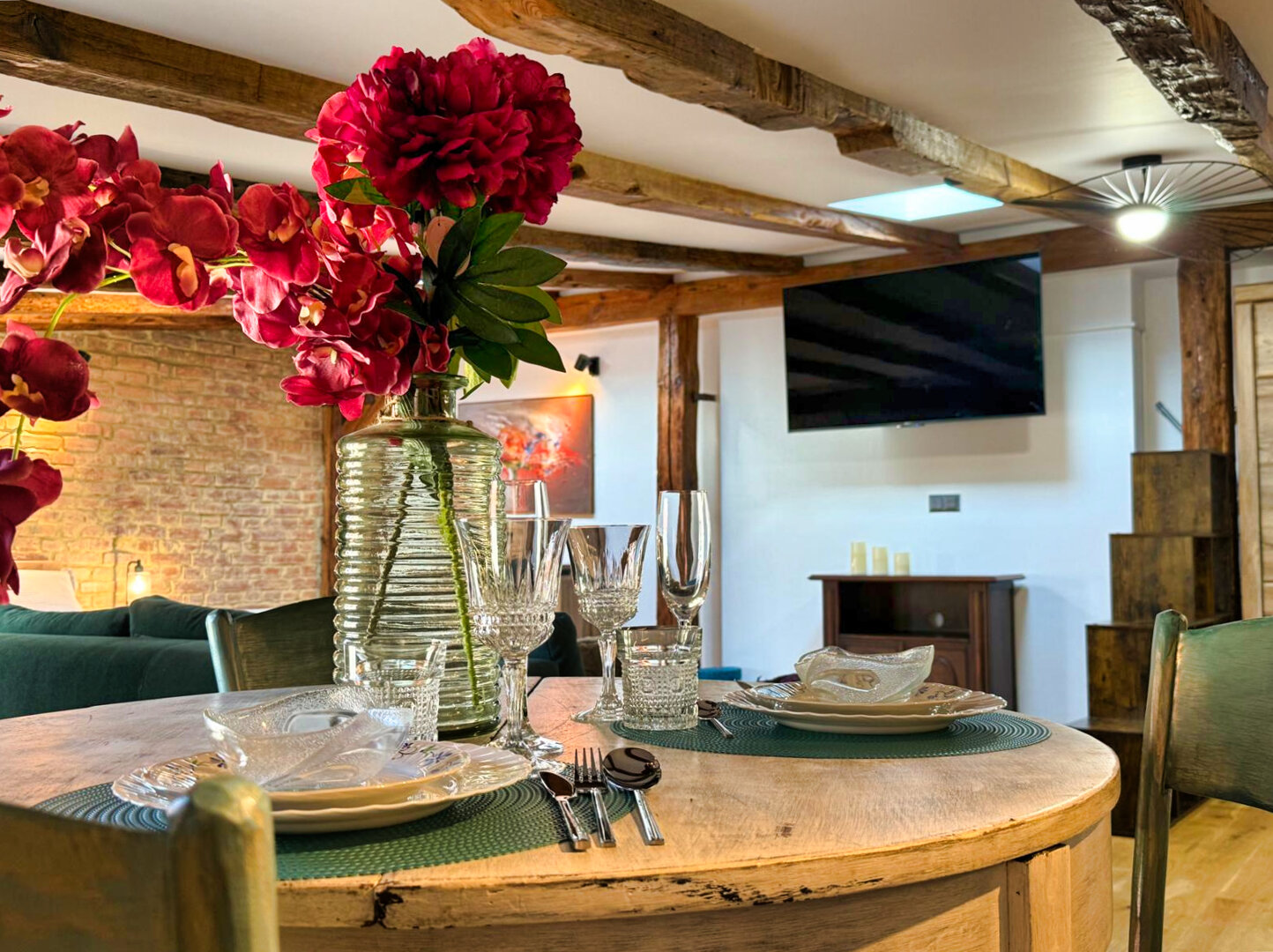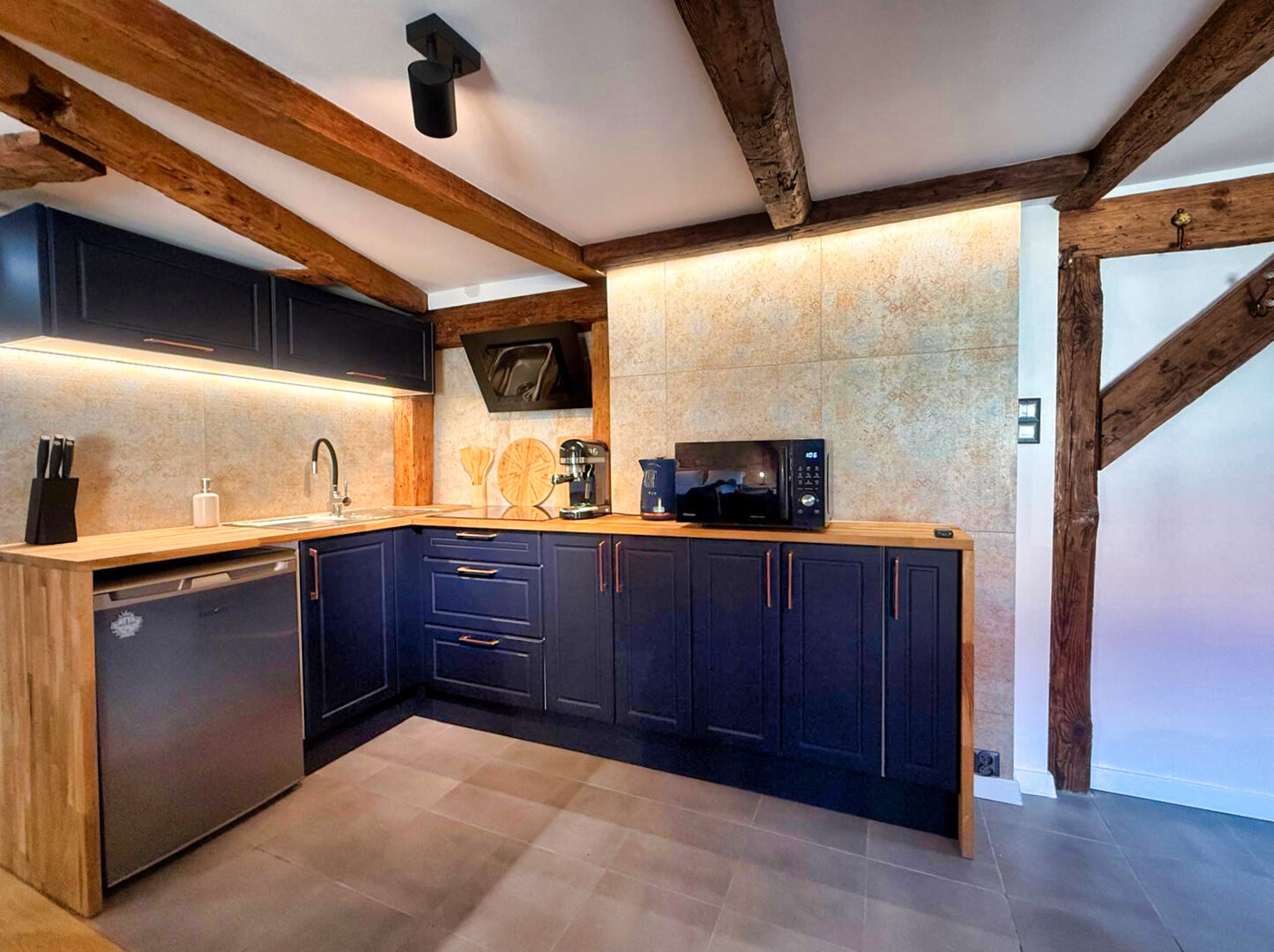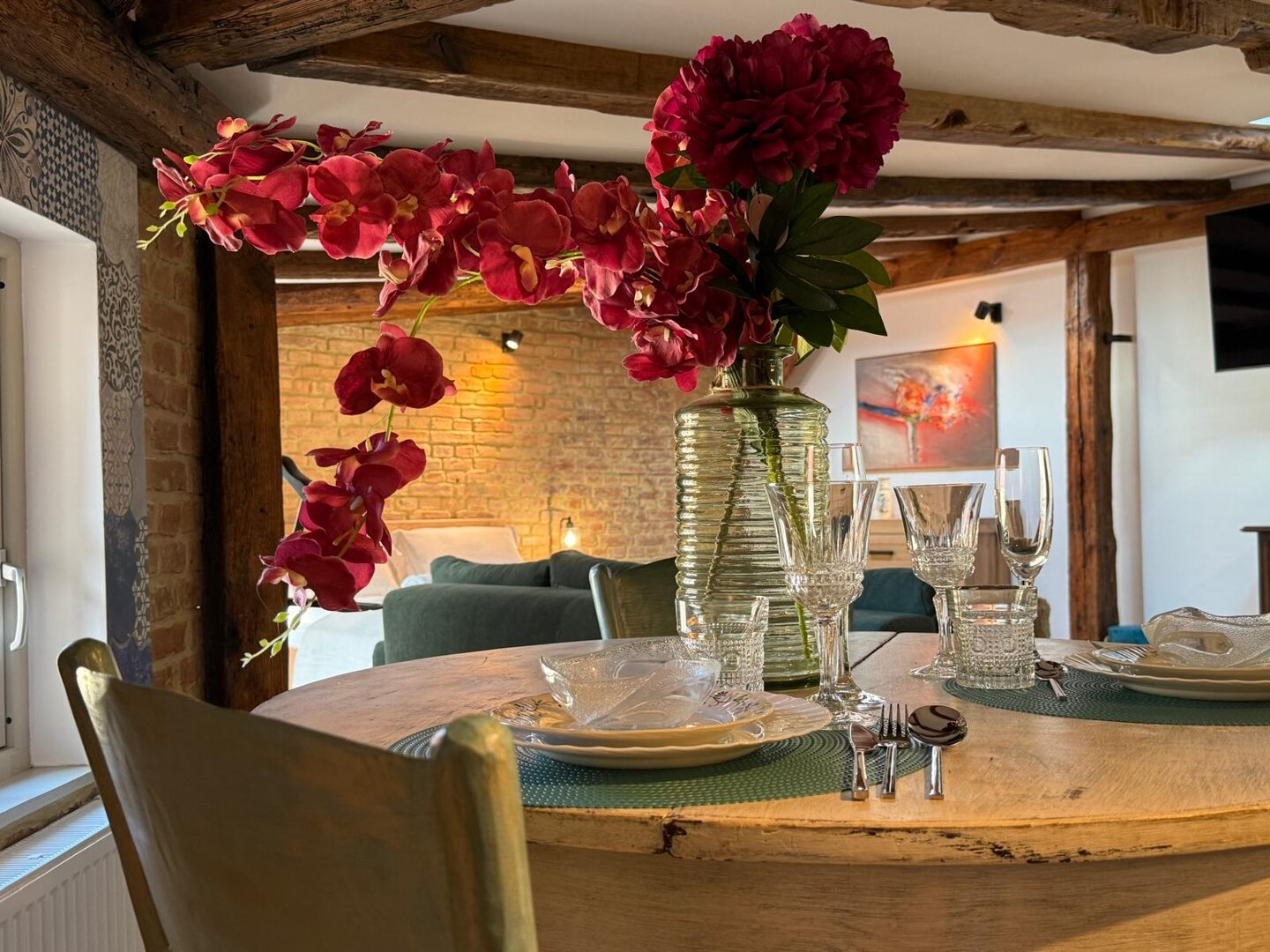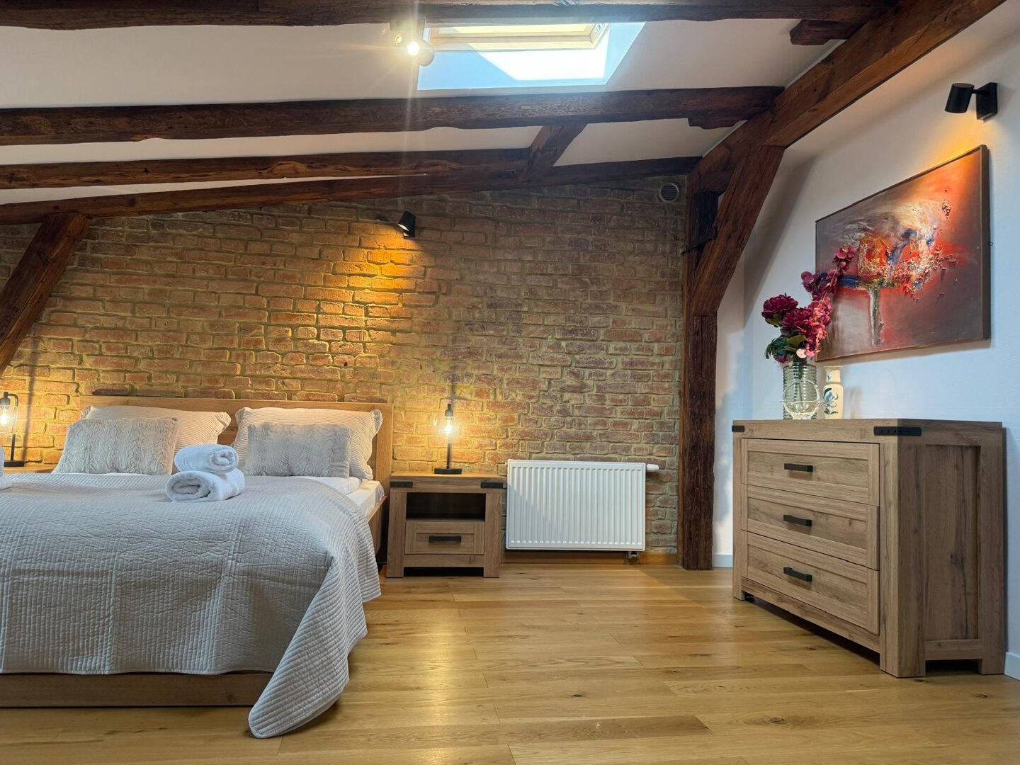 Type and Standard• Self-contained apartment• 50 m², attic of a historic tenement house• Max. 4 people• Central location in Toruń Old Town• No elevator (4th floor)• Private entranceSpace and sleeping• Double bed• Living area with a sofa bed• Storage space• Dining table, lounge areaKitchen• Fully equipped• Refrigerator• Stovetop• Coffee maker• Electric kettle• Kitchenware, microwave