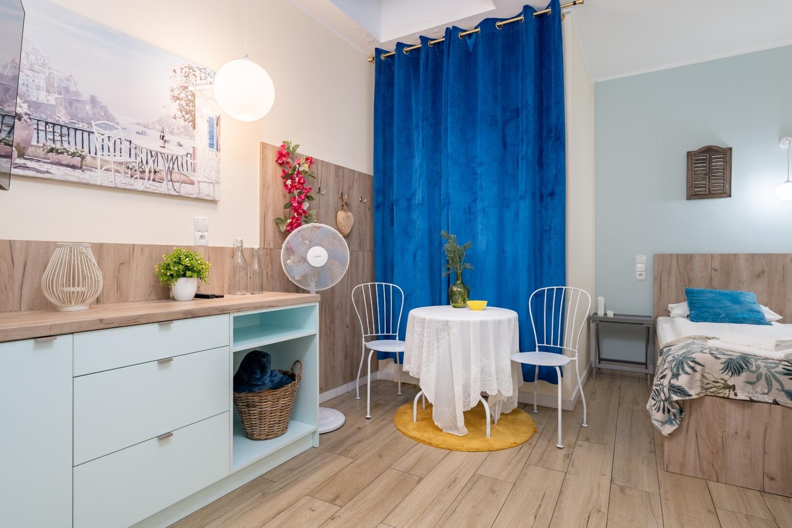 SPACE AND SLEEPING• 1 open-plan living area• Sleeps up to 6 people• Two double beds and a sofa bed• Damask bedding